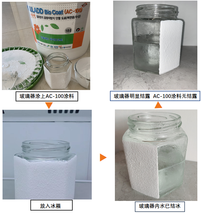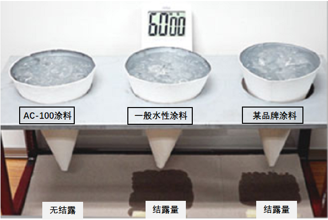 ④ 玻璃器明显结露,AC-100涂料未见结露现象,且一直保持干爽状态。
