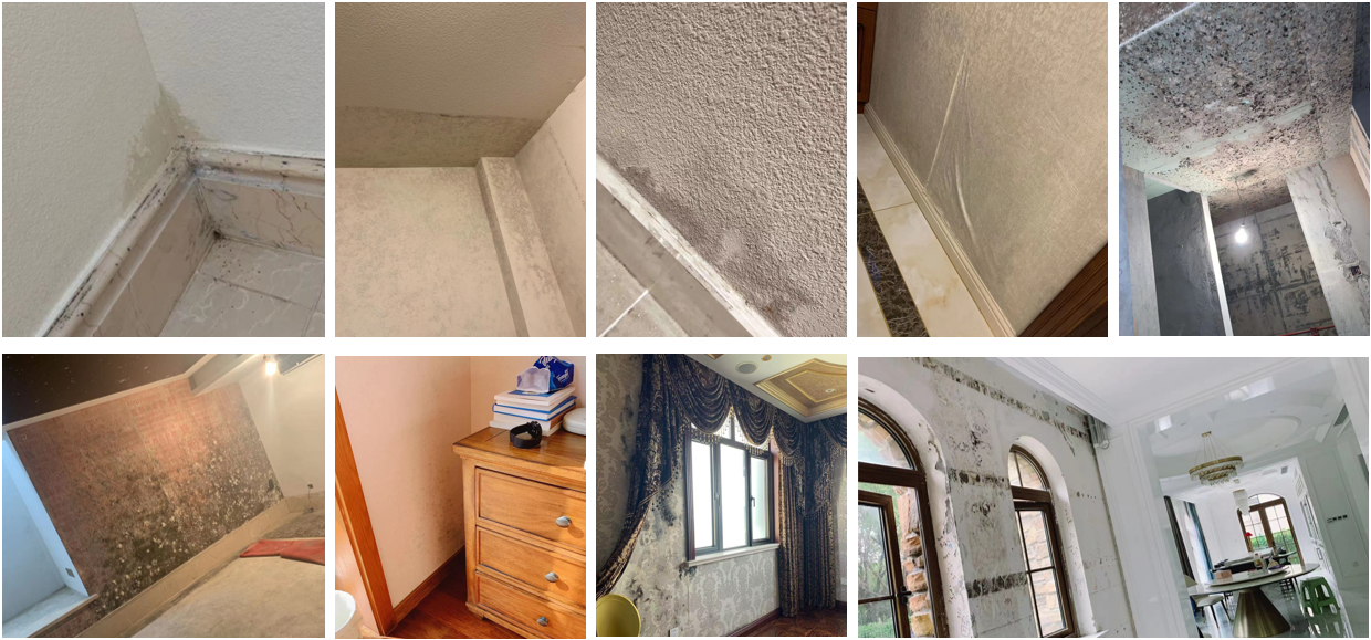 室外的冷热对流所产生室内外温差会导致冷凝水珠,如室内空调、地暖。 容易出现霉变区域:地下室踢脚线往上10-50cm,地下室天花,阳光房