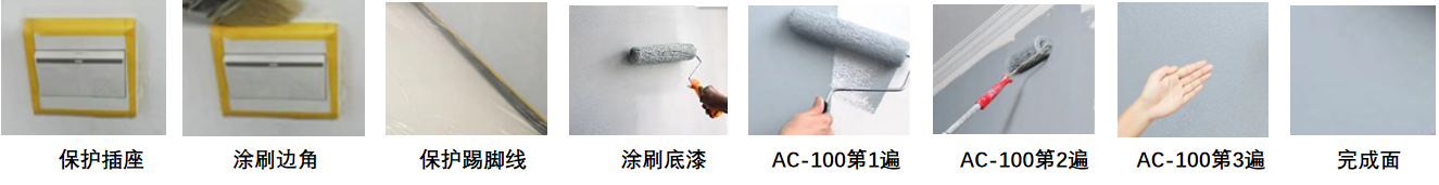 1、 正常房间施工:腻子打磨平整光滑后,滚刷底漆1遍,再滚涂3遍(AC-100)防霉防结露多功能涂料即可。